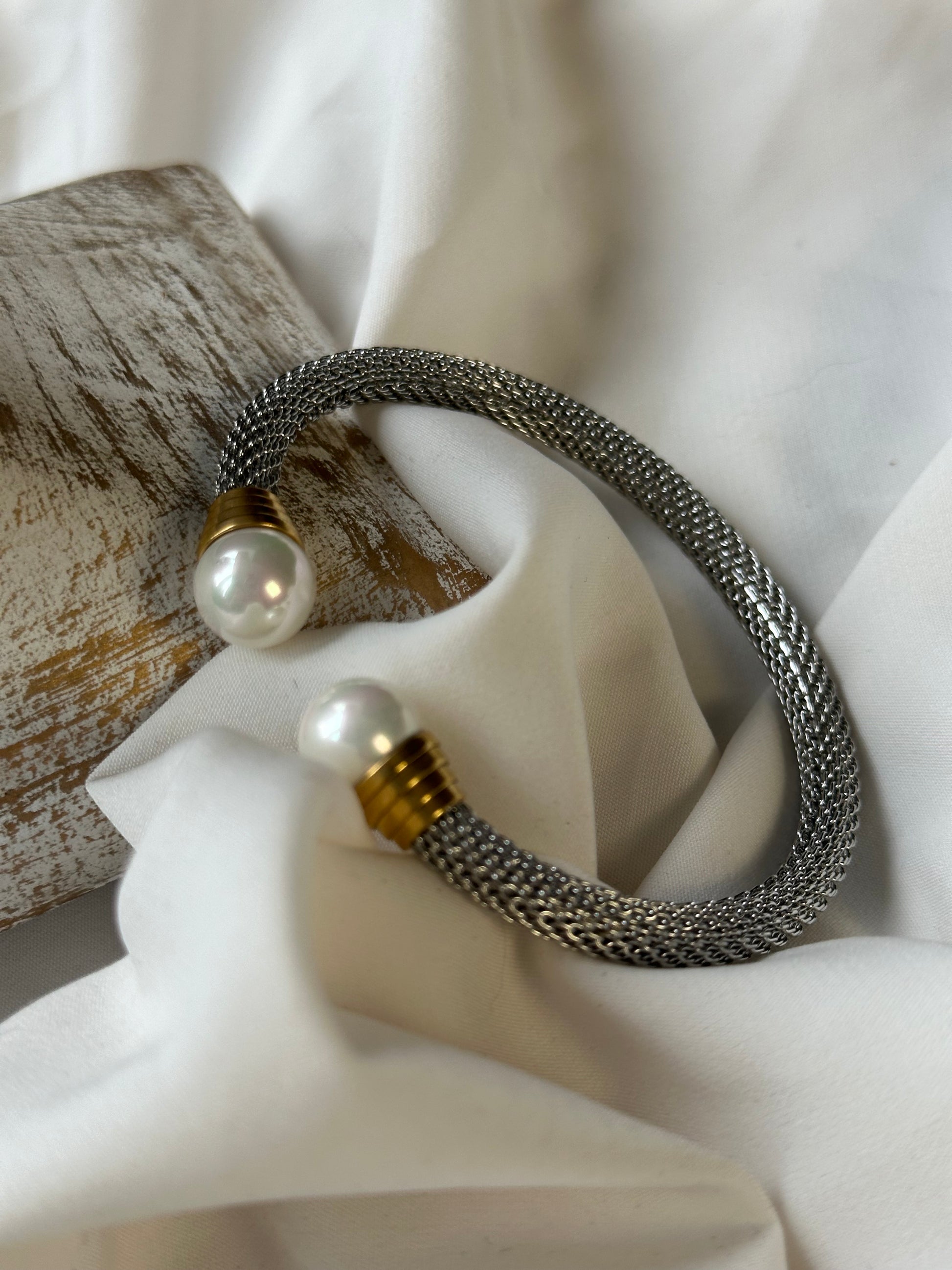 Aσημένιο βραχιόλι με συρμάτινες λεπτομέρειες και ατσάλινα χρυσά στοιχεία με πέρλα στο τελείωμα.