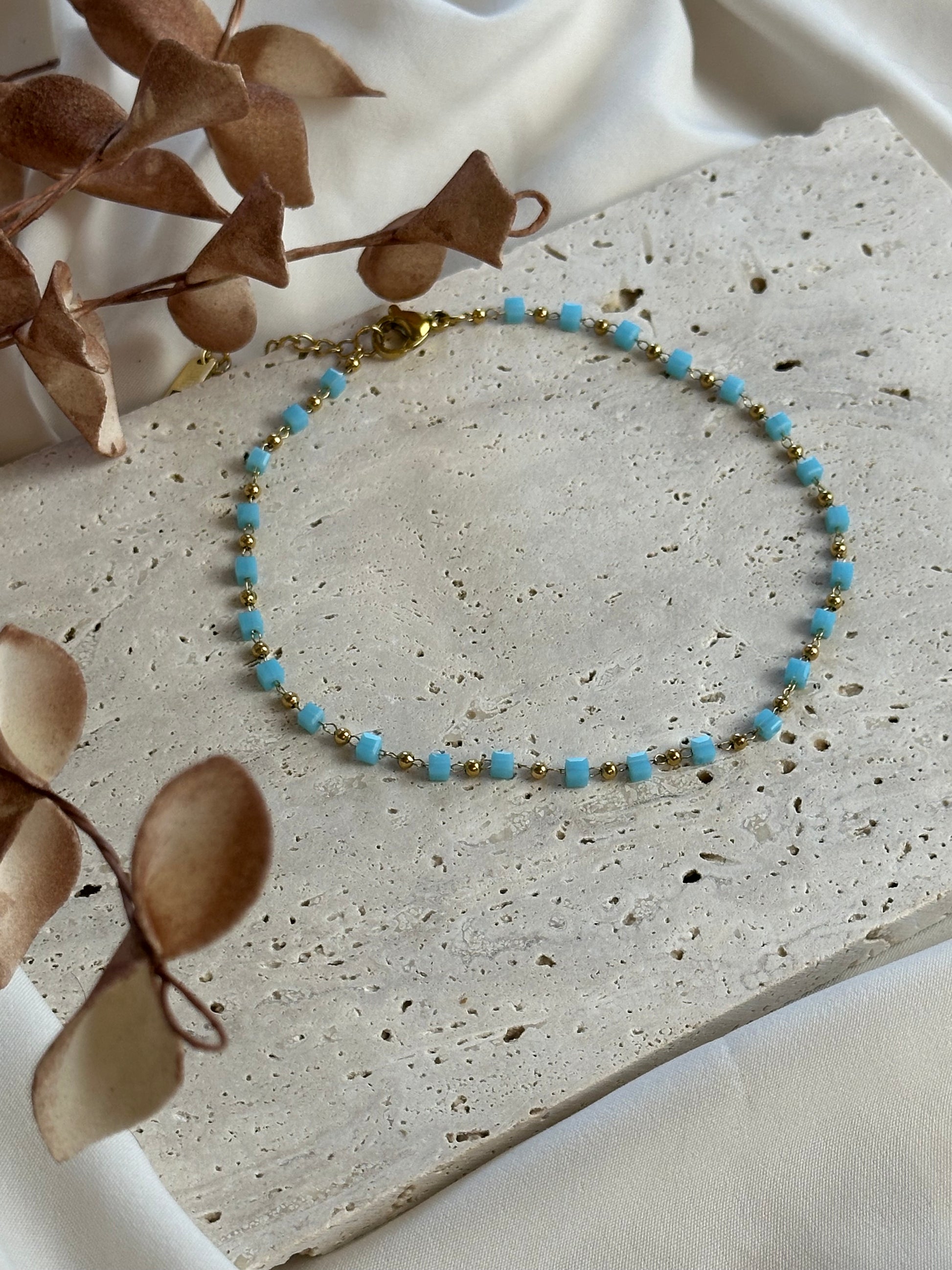 Χρυσή αλυσίδα ποδιού αποτελούμενη από γαλάζιες και χρυσές χαντρούλες.